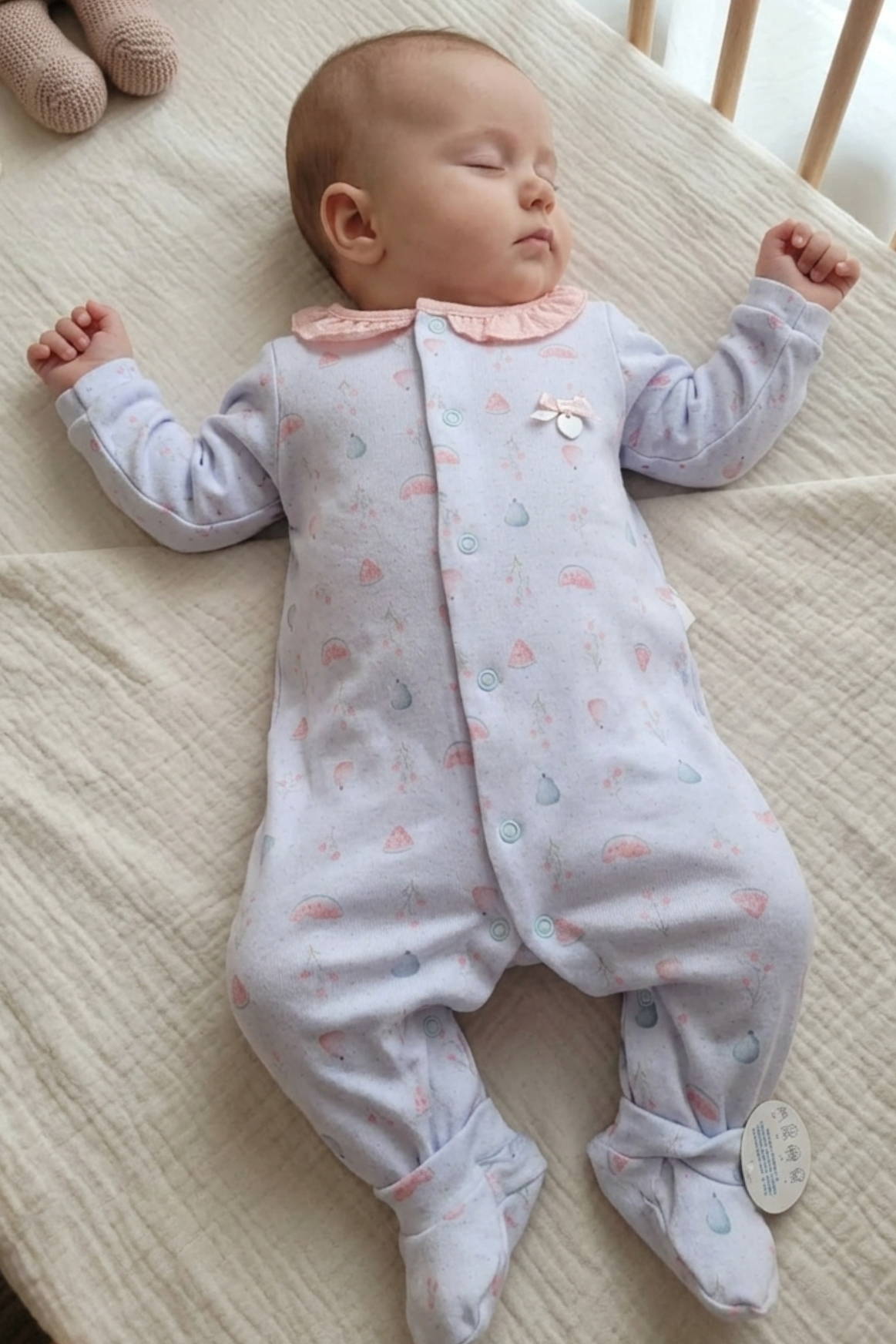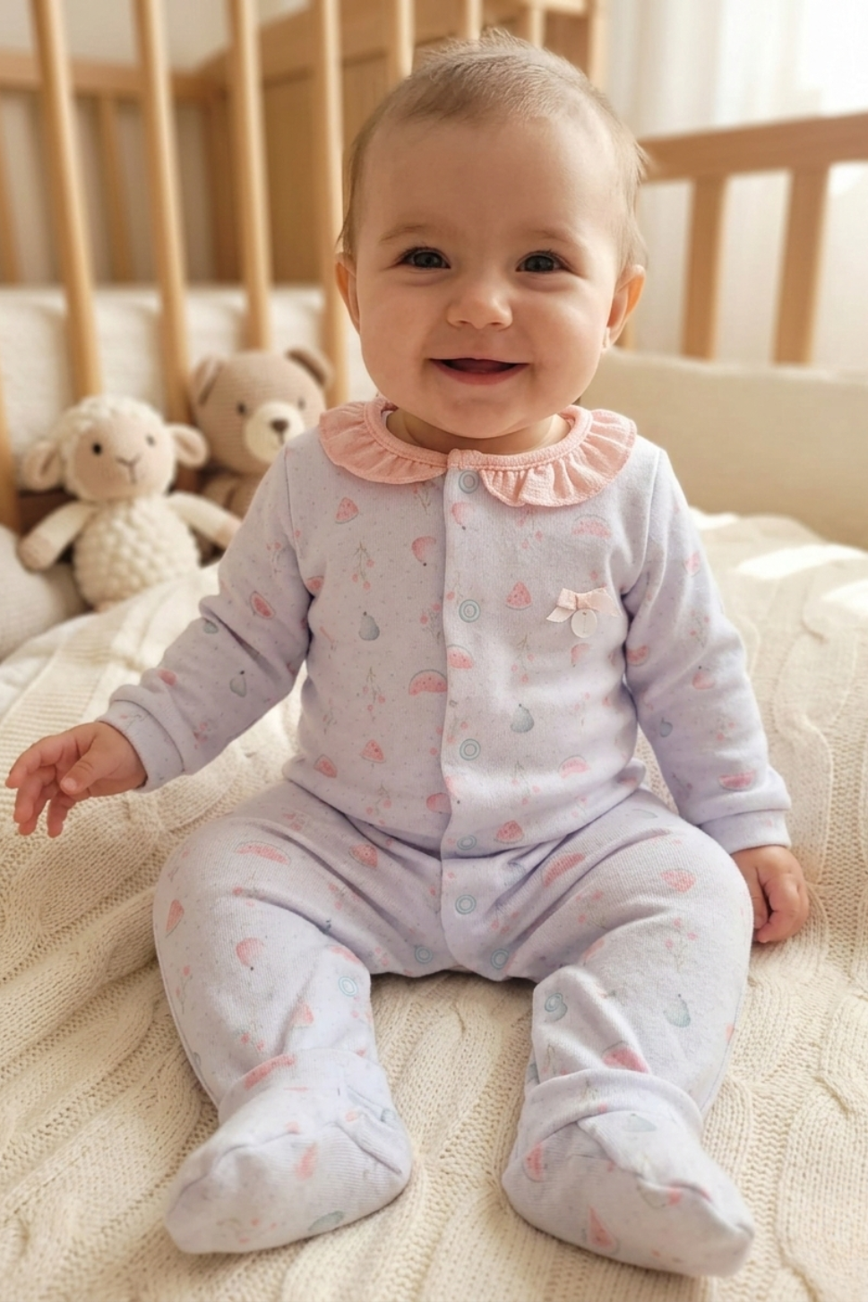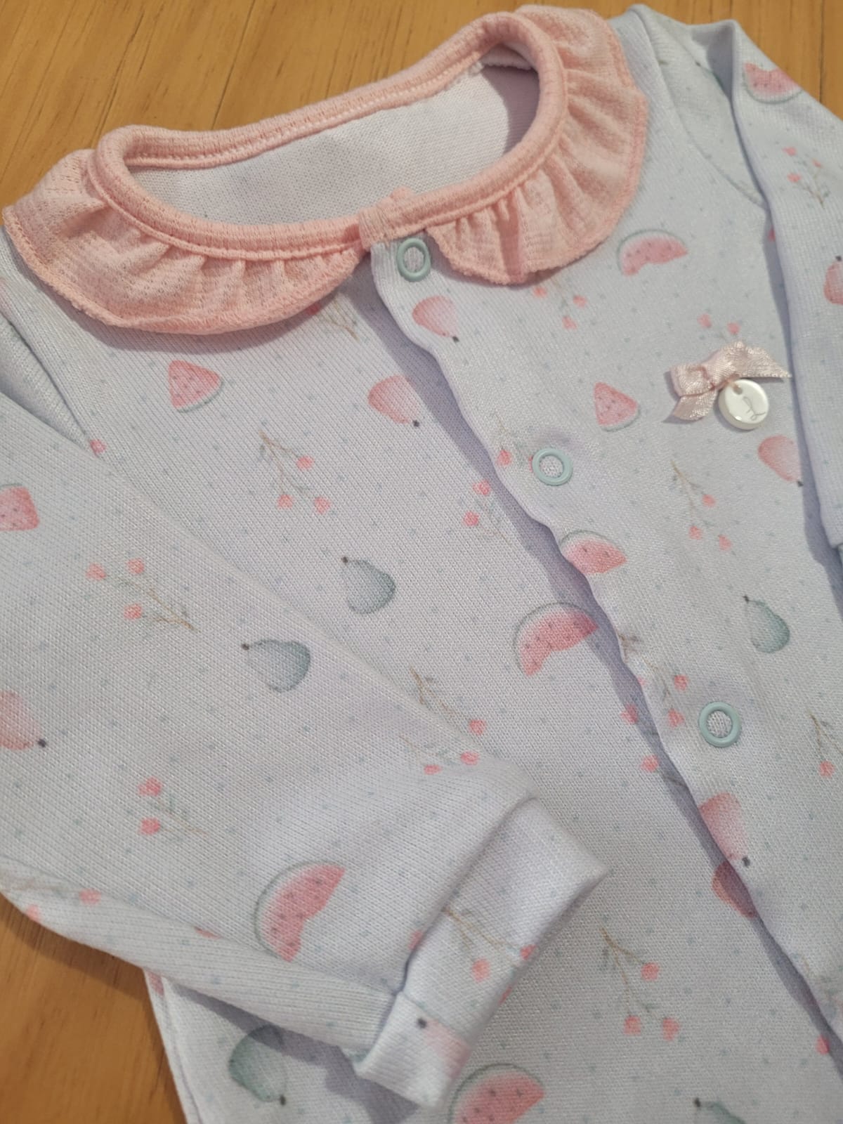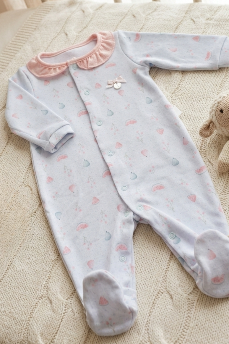 Design Delicado: Gola boneca em tom contrastante (rosa chá) e estampa suave de frutinhas (melancia e peras).