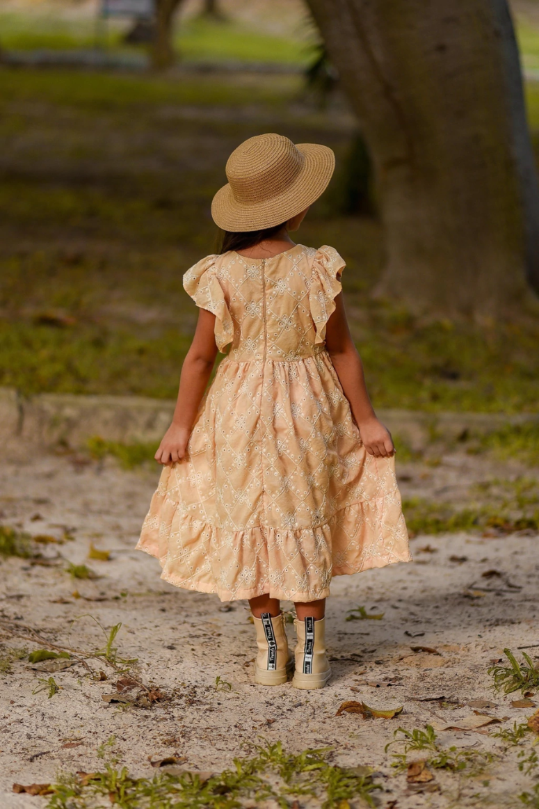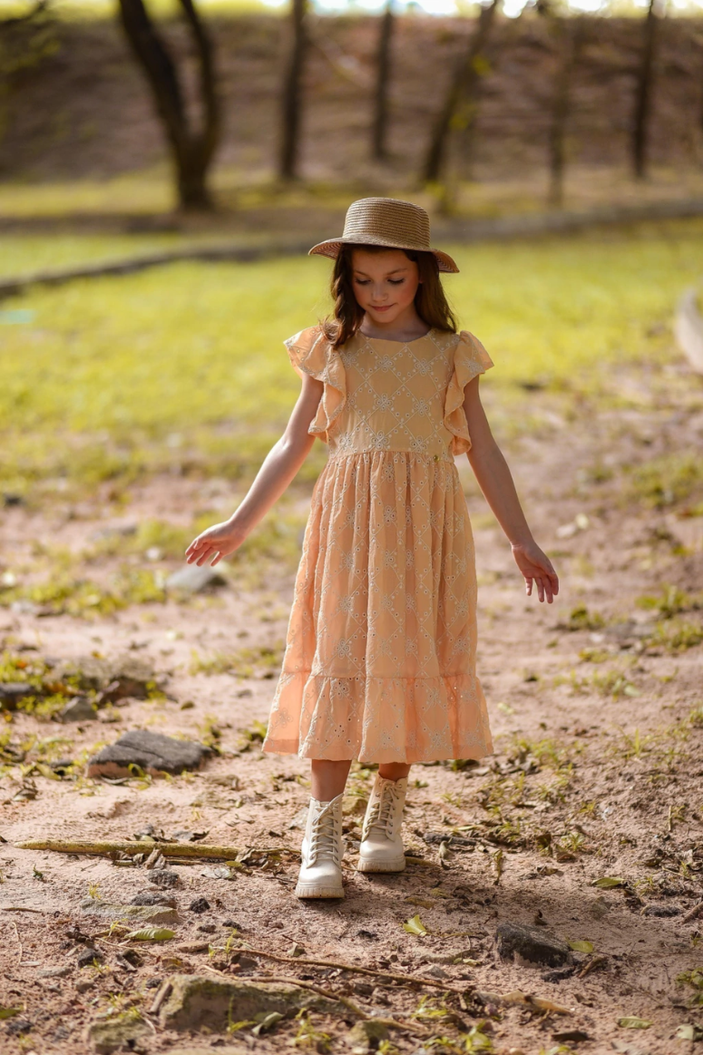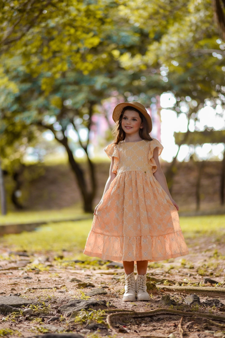 Vestido Infantil Midi Pêssego com Bordado Delicado – Elegância Romântica para Momentos Inesquecíveis