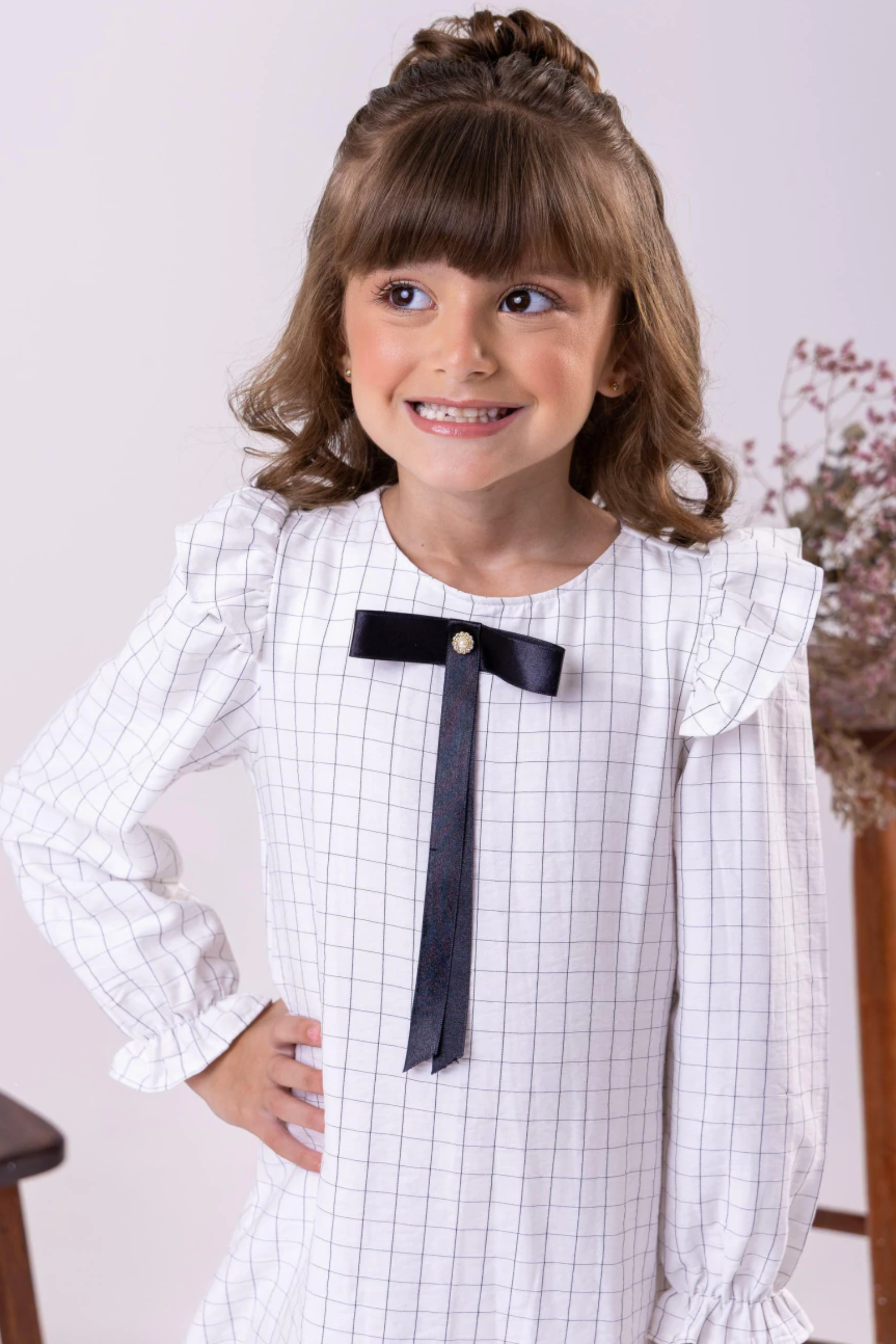 Vestido Infantil Manga Longa Alfaiataria Xadrez com Laço Preto Chique